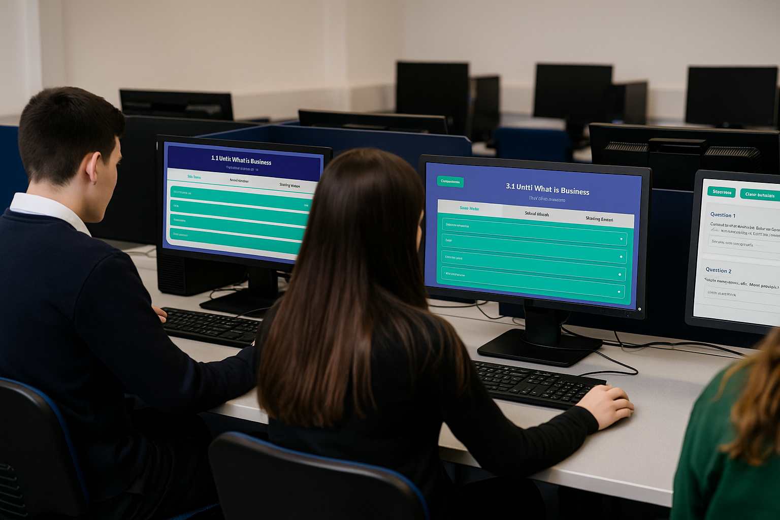 The bundle includes interactive glossaries, mix-and-match activities, and self-marking quiz modes for every major unit — from Business Forms and Leadership to Strategy and Financial Management. Each topic is presented through an intuitive, tab-based layout that allows learners to explore key terms, test recall through matching games, and apply understanding in short-answer challenges. Every HTML module is fully self-contained, making it ideal for classroom use, independent study, or blended learning environments.