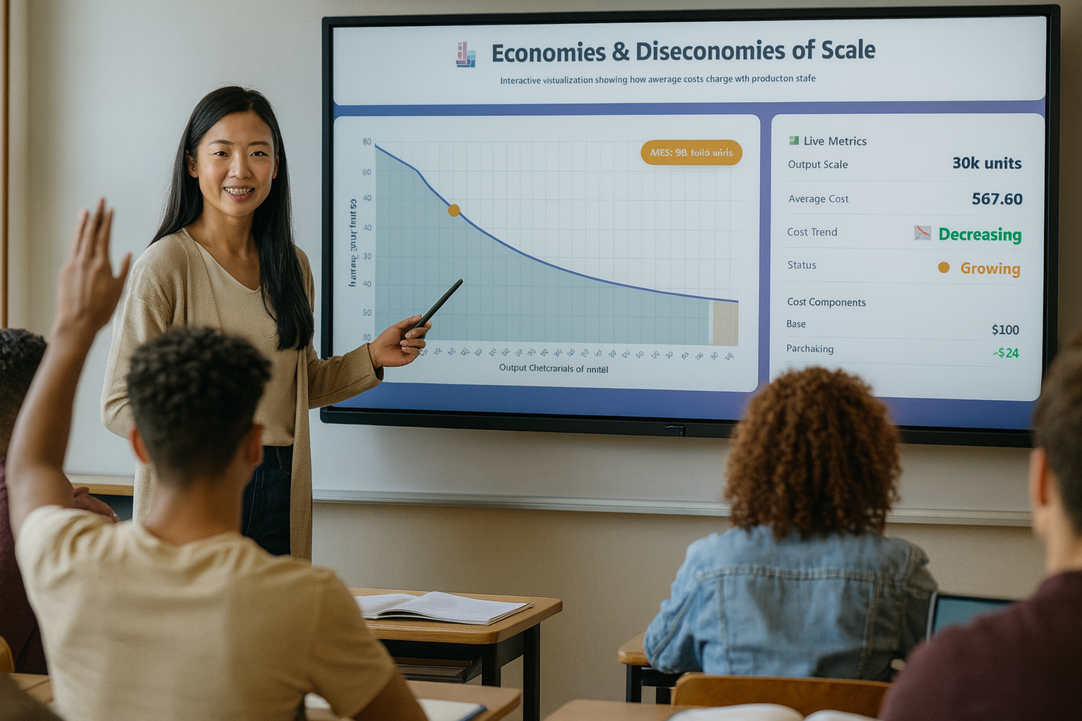 This tool models the classic U-shaped average cost story as scale grows, but it adds clarity by marking the Minimum Efficient Scale (MES) range right on the chart and shading the economies and diseconomies regions. A live metrics panel shows output scale, current average cost, trend direction, and status, while a slider moves production along the curve. Crucially, students can toggle individual causes—purchasing power, technical efficiency, management, marketing, finance, along with coordination, communication, bureaucracy, and motivation—to see how each force pushes costs up or down at different scales. A waterfall-style breakdown reveals which causes dominate at the selected output, and preset scenarios (fast food, manufacturing, large corporation, startup) jump learners to realistic combinations so they can compare sectors quickly and discuss why costs differ.
