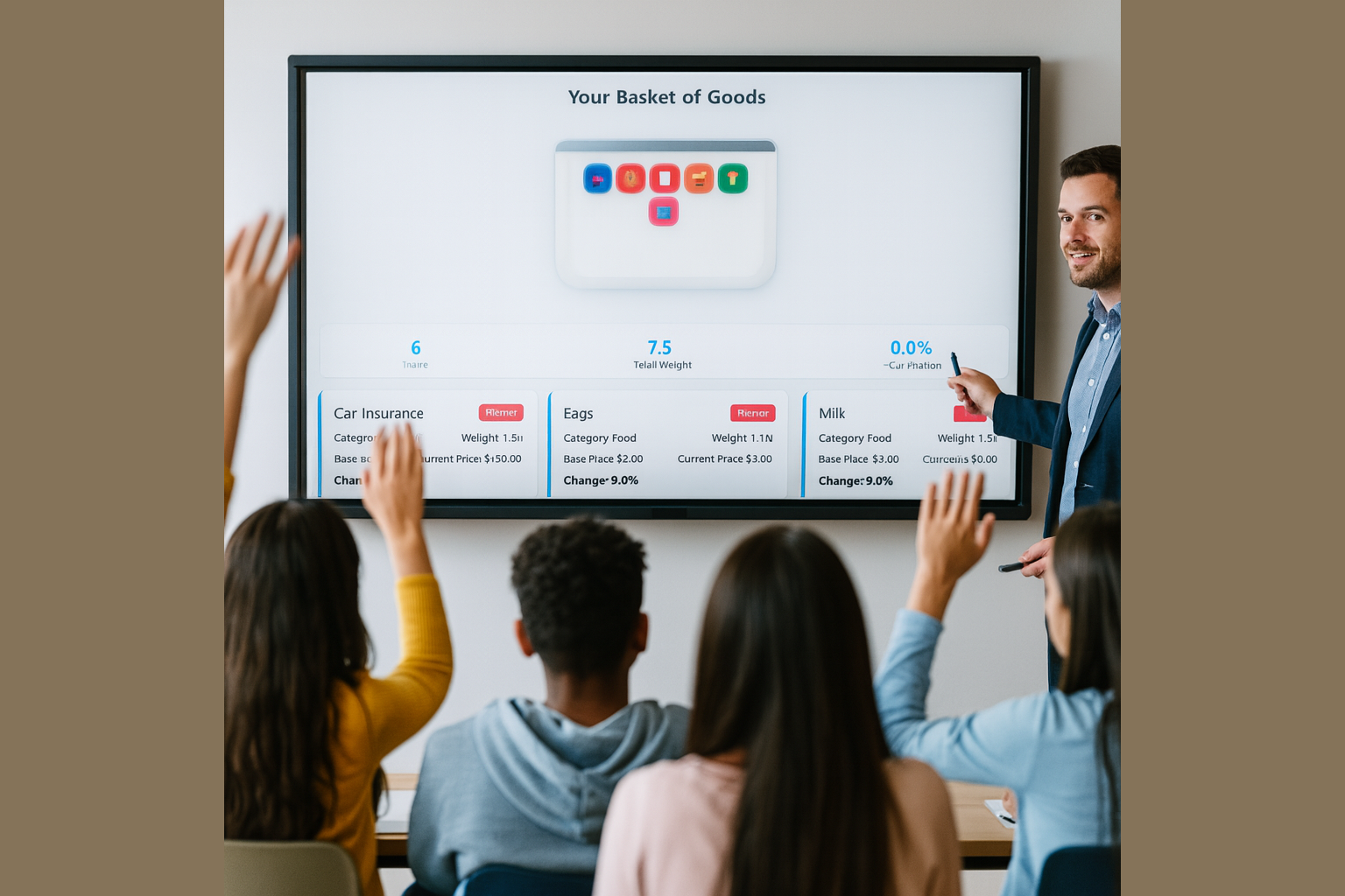Bring inflation to life with an interactive simulator that turns abstract CPI theory into a hands-on experiment. Learners build their own “basket of goods,” set base prices, and assign weights that mirror real-world importance—then watch a sleek, animated basket fill with emoji-icons and live stats that respond instantly to their choices.